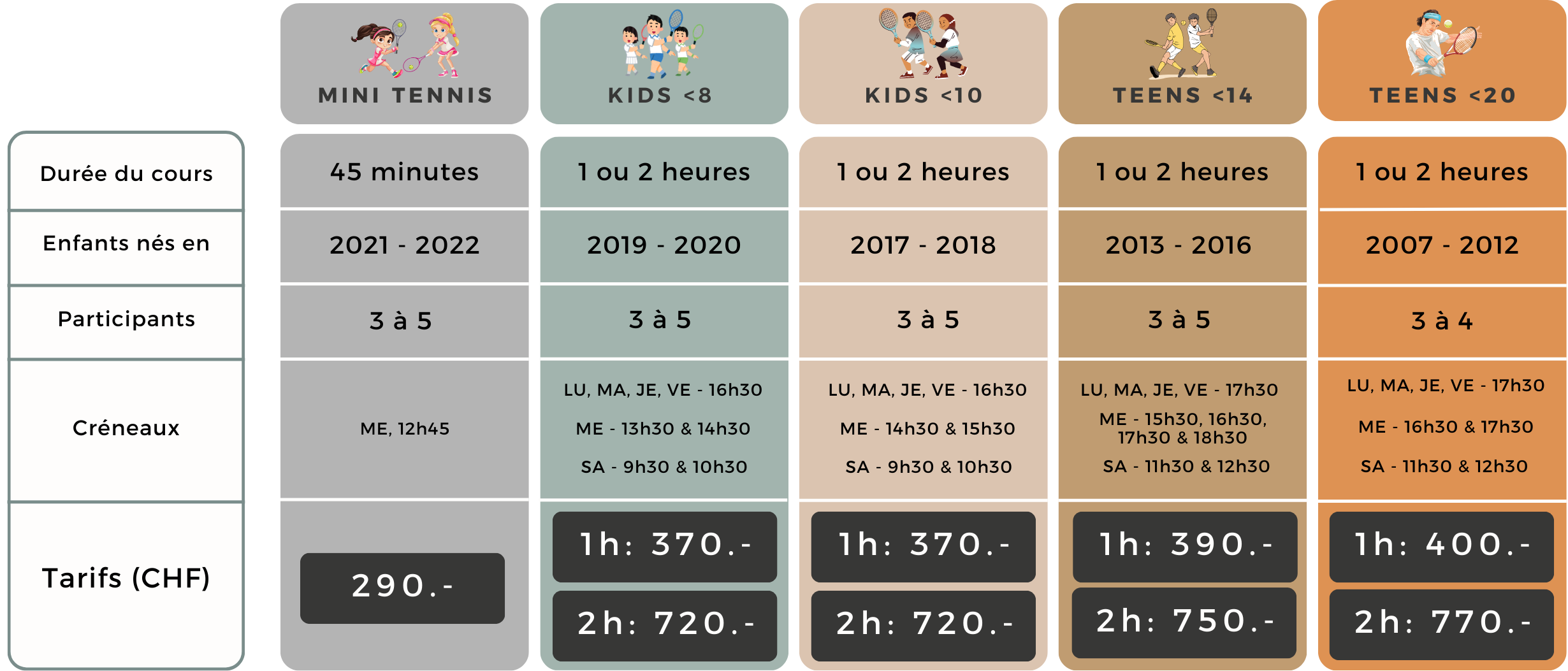 L’équipe de professeurs du TC Lutry se réjouit d’accueillir vos enfants pour la saison estivale, qui se déroulera :